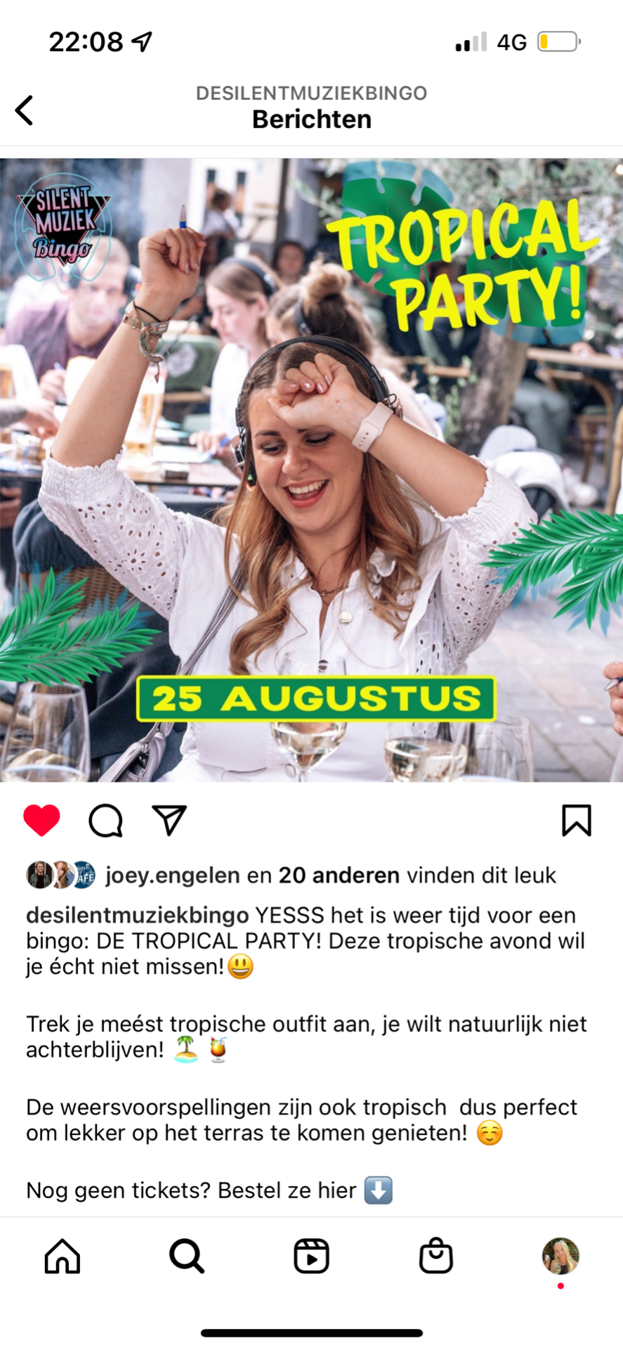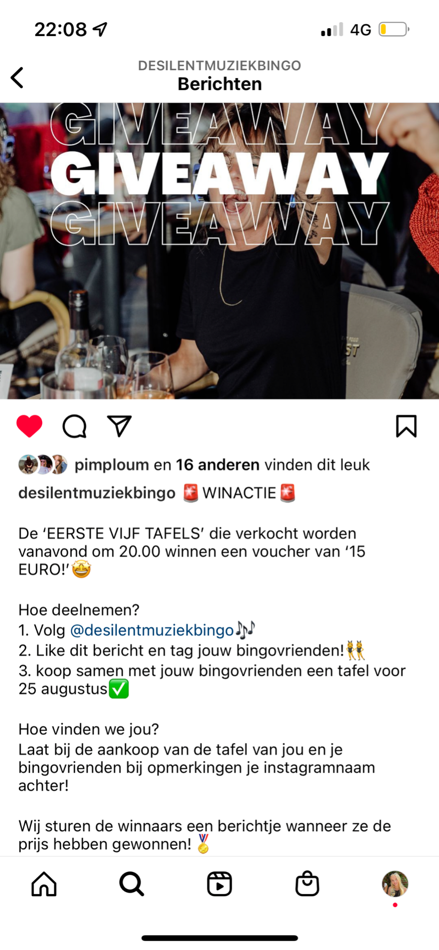 Instagram post: dit is een winactie voor tegoed om te gebruiken tijdens de silent muziekbingo, hiervoor moest je kaarten kopen om mee te kunnen doen.