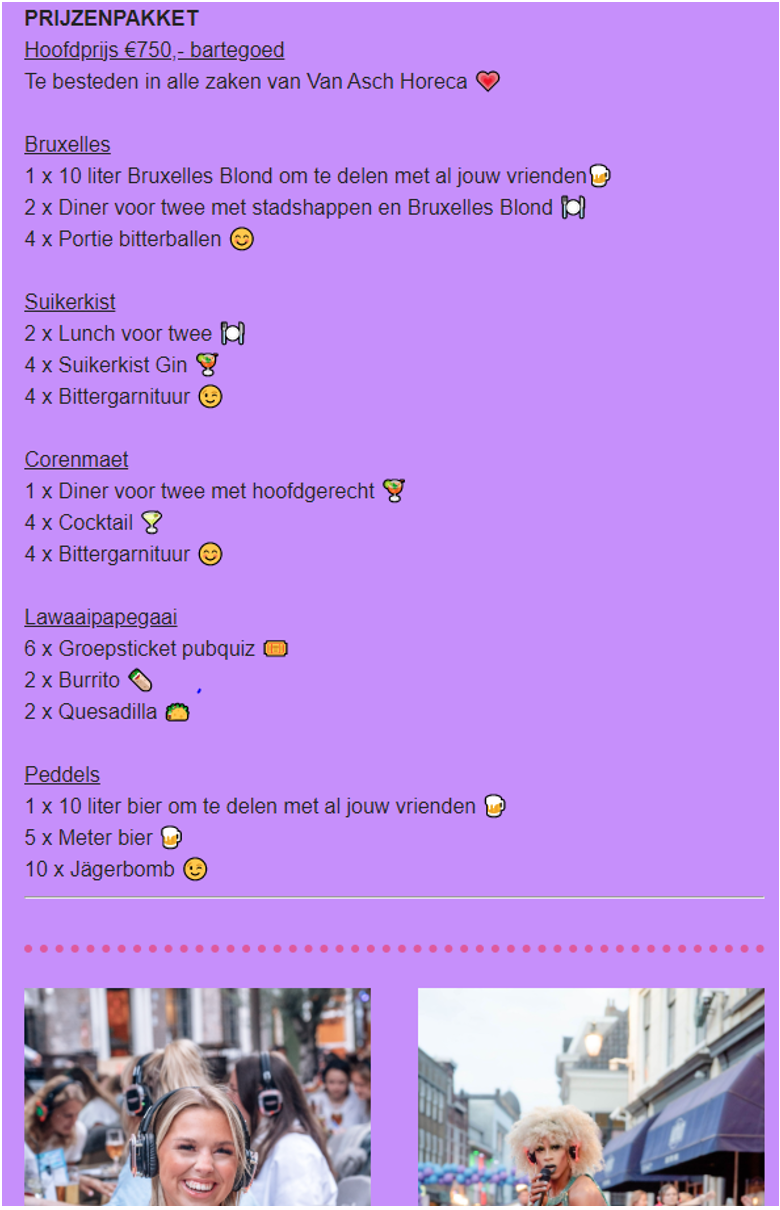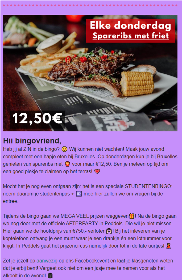 mail muziekbingo: Deze mail is gericht naar alle mensen die ene kaartje gekocht hebben voor de silent muziekbingo, deze mail is in mailchimp gemaakt dus is er een screenshot van gemaakt. De gehele mail is ook naar engels vertaald maar de tekst was precies hetzelfde. Het is een laatste info mail over de prijzen en nog belangrijke dingen die goed zijn om te weten om vragen te voorkomen op de bingo zelf.