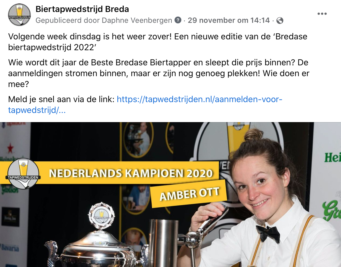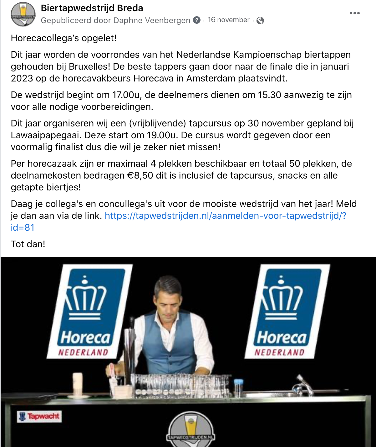 Er kunnen zich per zaak maar 4 mensen aanmelden dus ben er snel bij en wie weet straal jij straks in de finale en behoor je tot een van de beste tappers van Nederland! Ik hoor wel wie interesse heeft!