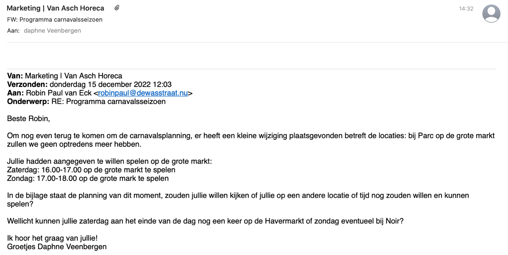 Mail: voor de Carnavalsprogrammering gericht aan blaaskapellen, voor dat de mail gestuurd werd heb ik met alle kapellen gebeld omdat die dat jaar ervoor ook hadden gespeeld. Na het telefoontje uitgekozen wie er geïnteresseerd waren er daar de eerste mail naar gestuurd. De 2e mail heb ik gestuurd 20 dagen later naar de mensen die nog geen reactie hadden gestuurd als kleine reminder.