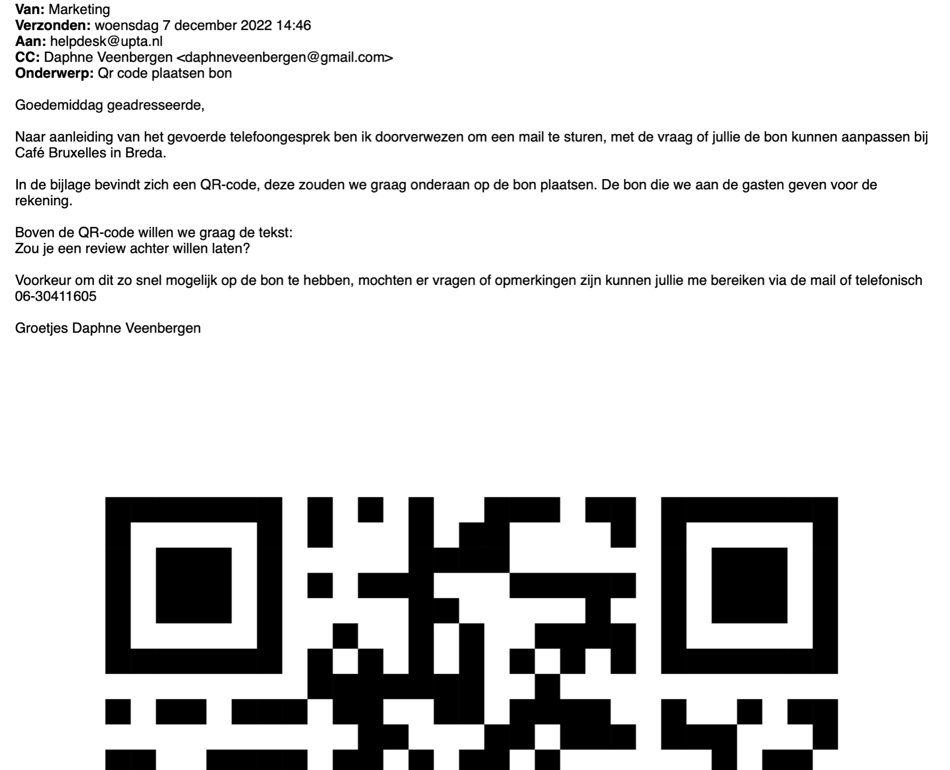 Mail & bellen: voor reviews bij Bruxelles wou ik graag op de rekening voor gasten een QR-code hebben. Hiervoor heb ik contact opgenomen met het bedrijf die hiervoor zorgt. Na telefonisch contact heb ik hierover een mail gestuurd.