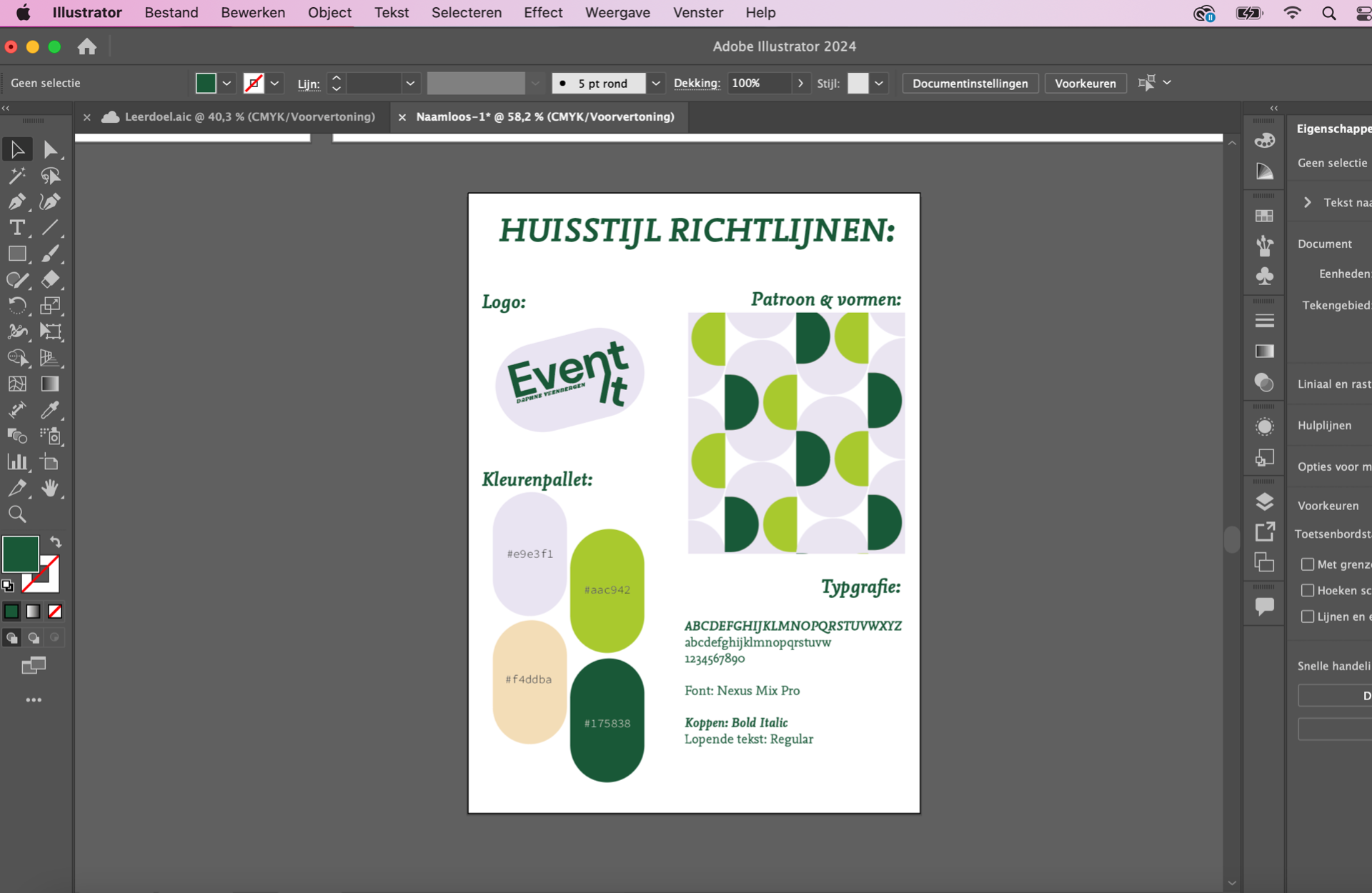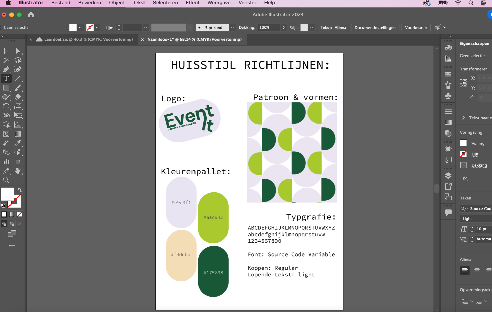 Situatie: mijn doel was om mijn grafische vormgevingsvaardigheden met Adobe te verbeteren om een professionele en consistente huisstijl te creëren voor mijn fictieve evenementenbedrijf, Event it.