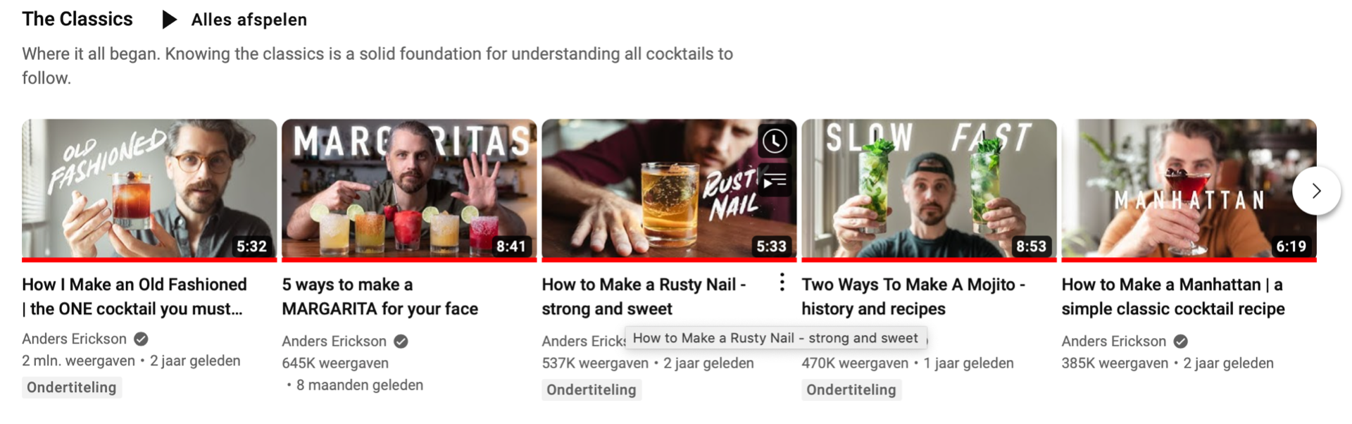 Na de cursus van Thomas ben ik erachter gekomen hoe interessant ik cocktails vind, daarom ben ik mezelf er verder in gaan verdiepen. Ik ben dan op het youtube kanaal van Anders Erickson beland, waar ik allemaal verschillende video's gevonden heb over cocktails.